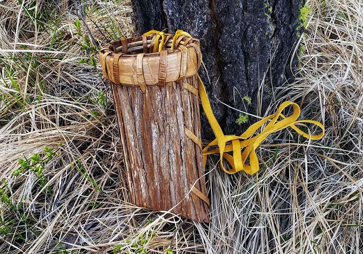 Cedar Bark Gathering Bucket (mxiłp), Patti Bailey, qʷn̓qʷin̓x̌n̓, photo: Diane Beals. This is a berry gathering basket made in the forest where the western red cedar grow. The bark is carefully pulled from a young cedar during the Spring when the sap is running. This basket is utilized by the Interior Salish people. Basket stitching and rim is sewn with cedar bark strips.