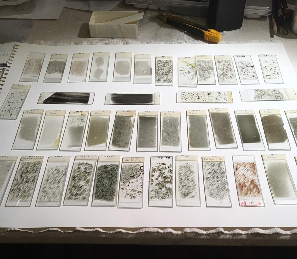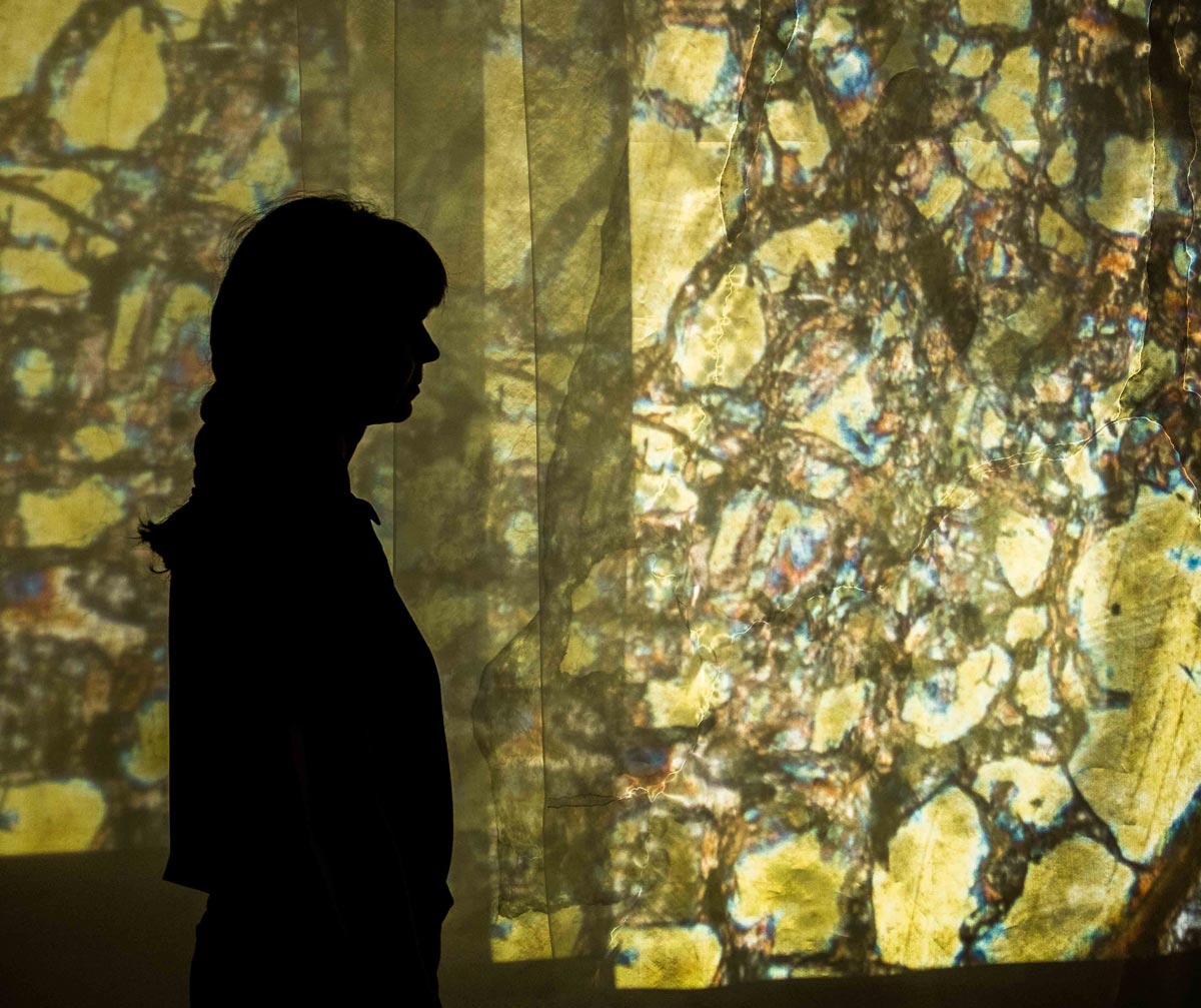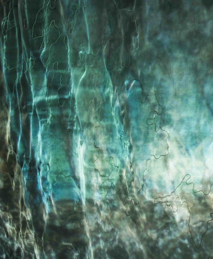 Nelson Batholith, detail ink and thread on silk organza and video projection of photomicrographs, 2020; photo: David Gluns