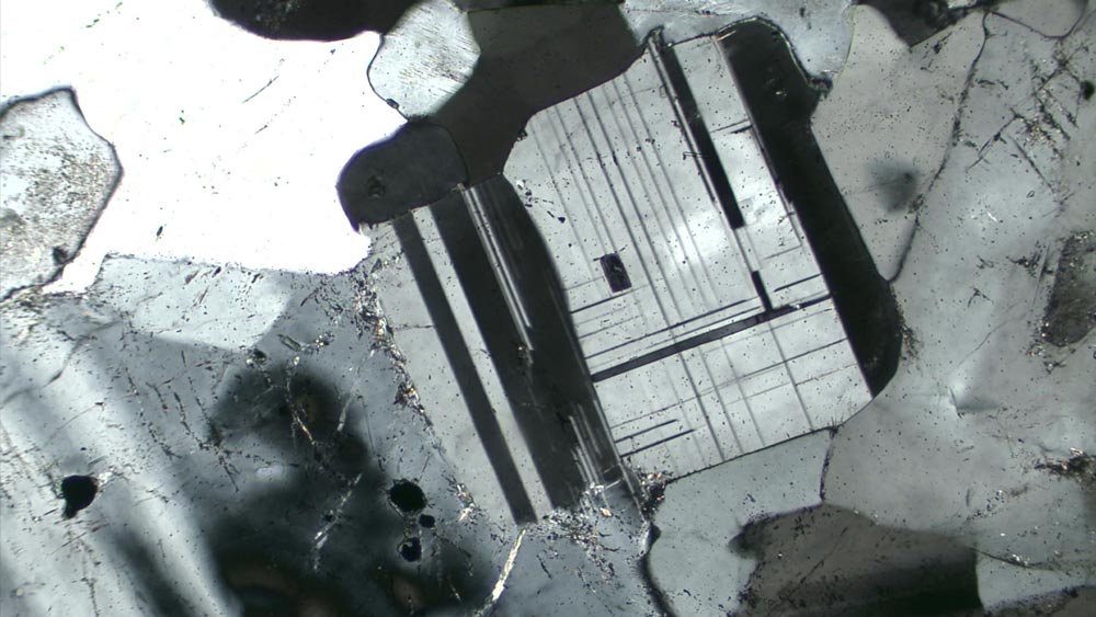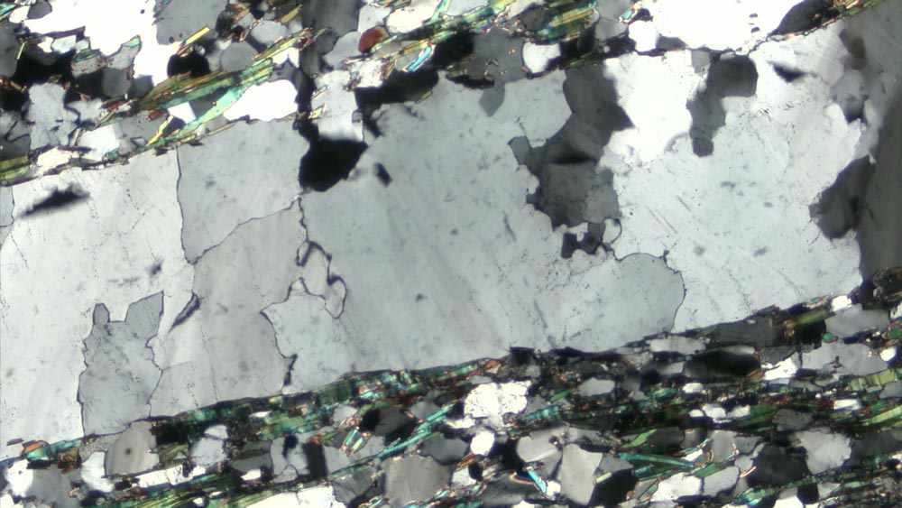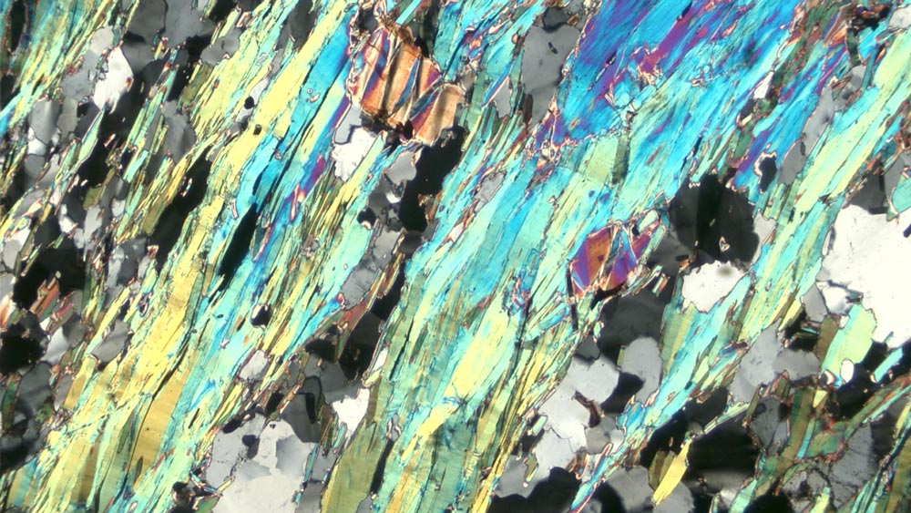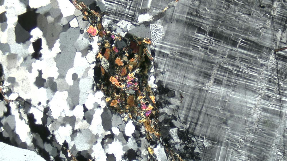 Photomicrographs were taken of thin sections (0.03 mm thick rock sample mounted on a glass plate) as viewed under a petrographic microscope. At the microscopic scale, one sees an interlocking mosaic of crystals, born under extreme pressure and temperature at 10–15 km deep, 170 million years ago. It is a glimpse of a melted continent and ocean floor; a result of two converging tectonic plates, one subsiding beneath the other. This dynamic geologic setting is the catalysing force behind mountain building in the Canadian Cordillera and continues today along the coast of British Columbia.